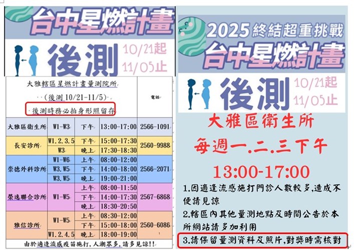 臺中市114年各區衛生所及醫療院所卡介苗(BCG)接種時間 臺中市大雅區衛生所 2024-12-30 臺中市114年各區衛生所及醫療院所卡介苗(BCG)接種時間及地點詳附件 請自行下載 ~臺中市大雅區衛生所關心您~