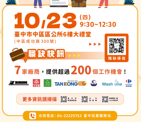 臺中市政府1023日上午9:3012:30,在臺中市中區區公所6樓禮堂舉辦2025「富市台中 就業成功」中區聯合徵才,邀請家樂福、大全聯、天工精密、昇峰起重等7家廠商徵才,提供超過200個工作機會,查詢相關資訊(另開新視窗),洽詢電話04-22225153