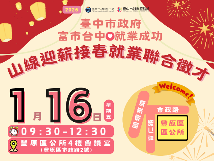 山線迎薪接春就業聯合徵才 好職、好機會,山線新年一次全網羅!臺中市就業服務處將於1月16日(星期五)上午9時30分至12時30分,在豐原區公所4樓會議室辦理聯合徵才,邀請台灣美光、聯亞科技、全家便利商店及新天地等共13家,提供超過450個職缺,歡迎把握機會踴躍參加,活動詳情請至臺中市就業服務處官網查詢 。