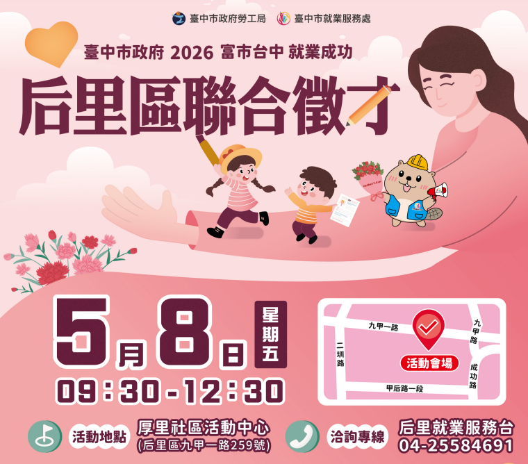 「富市台中 就業成功」后里區聯合徵才 五月工作機會選擇多!臺中市就業服務處於5月8日(星期五)上午9時30分至12時30分,在厚里社區活動中心辦理聯合徵才,邀請正隆紙業、台灣美光、豐興鋼鐵及旭東機械等9家在地廠商,提供超過300個職缺,歡迎把握機會踴躍參加,活動詳情請至臺中市就業服務處官網(另開新視窗)查詢 。