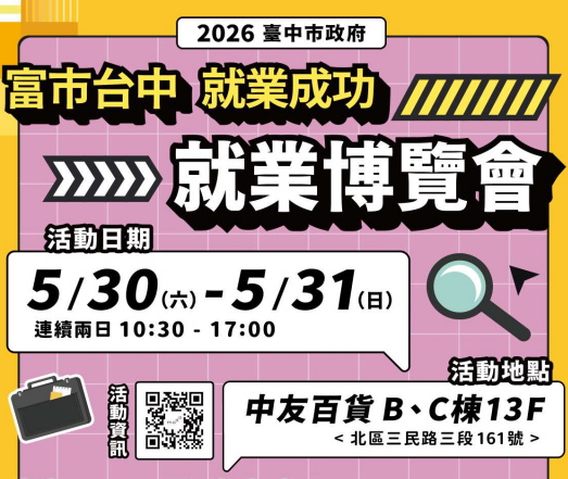 「富市台中 就業成功」就業博覽會 臺中市政府5/30(六)及5/31(日)10:30-17:00,在中友百貨B、C棟13樓舉辦2026「富市台中 就業成功」就業博覽會,邀請台灣美光、聯亞科技、矽品、無印良品、麥當勞等60家廠商,提供3,000個職缺,查詢相關資訊(另開新視窗),洽詢電話04-22225153。